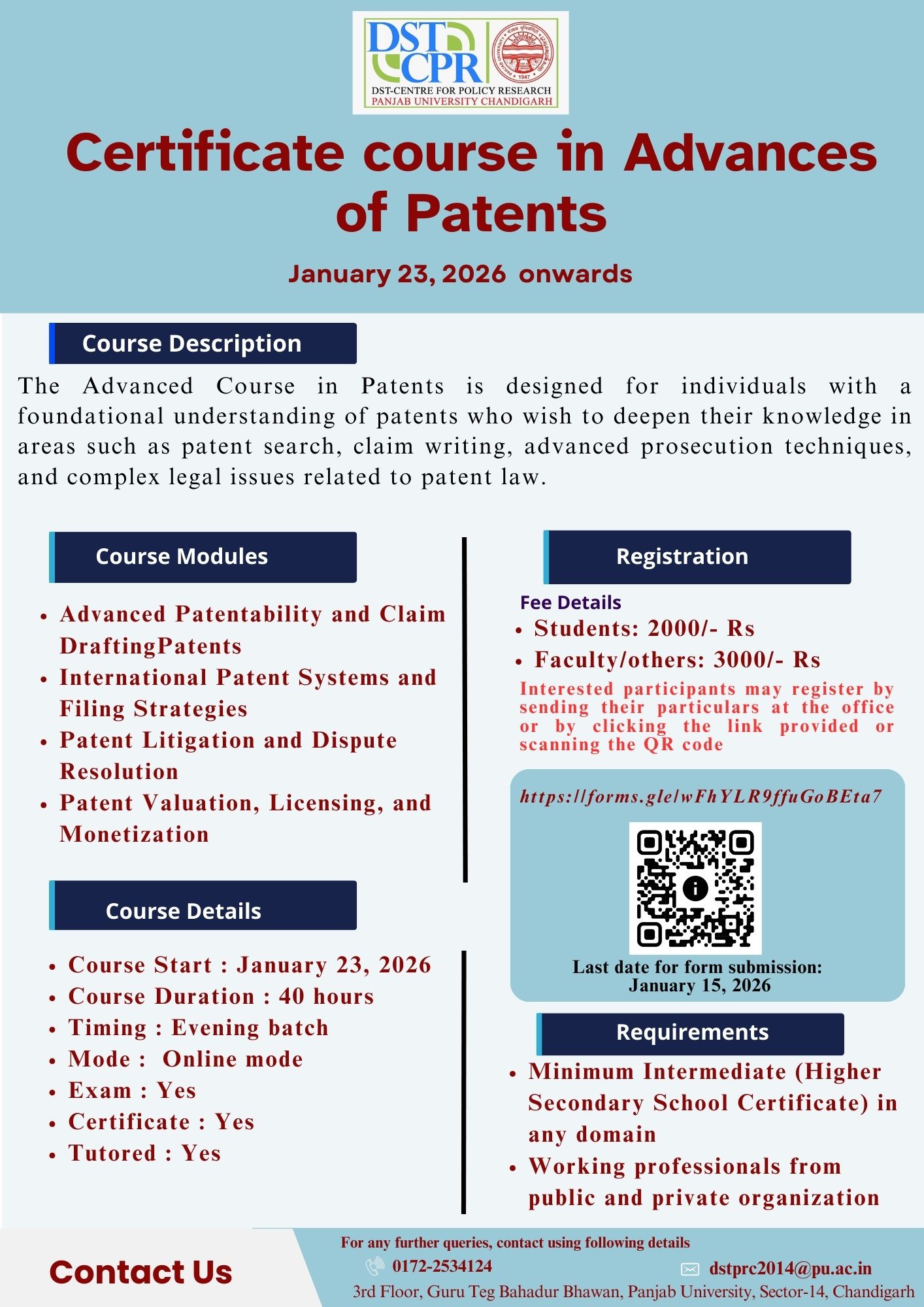A advance course in patents is offered by DST-Centre for Policy Research (CPR), Panjab University, Chandigarh. The Advanced Course in Patents is designed for individuals with a foundational understanding of patents who wish to deepen their knowledge in areas such as patent search, claim writing, advanced prosecution techniques,