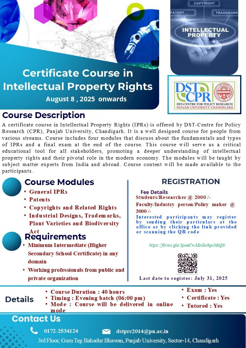 A certificate course in Intellectual Property Rights (IPRs) is offered by DST-Centre for Policy Research (CPR), Panjab University, Chandigarh. It is a well-designed course for people from various streams. The course includes four modules that discuss the fundamentals and types of IPRs and a final exam at the end of the course. The modules will be taught by subject matter experts from India and abroad. Course content will be made available to the participants.